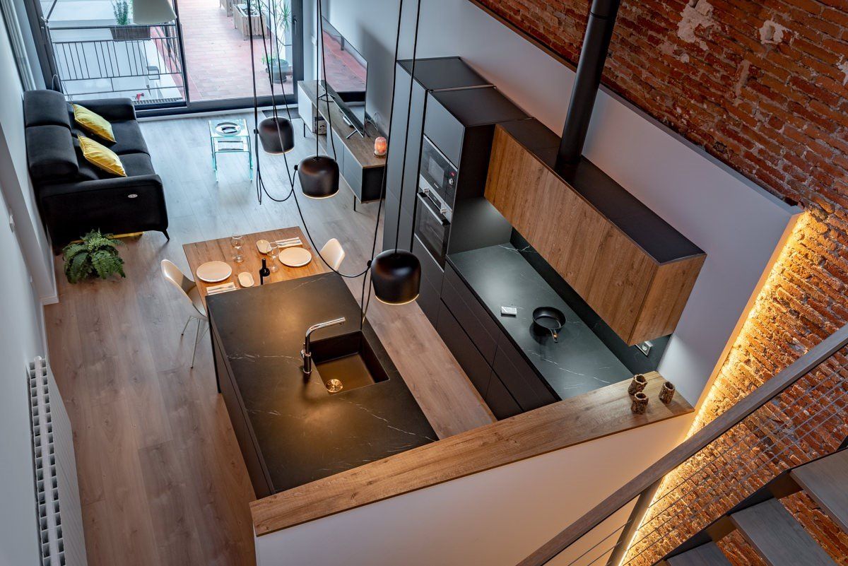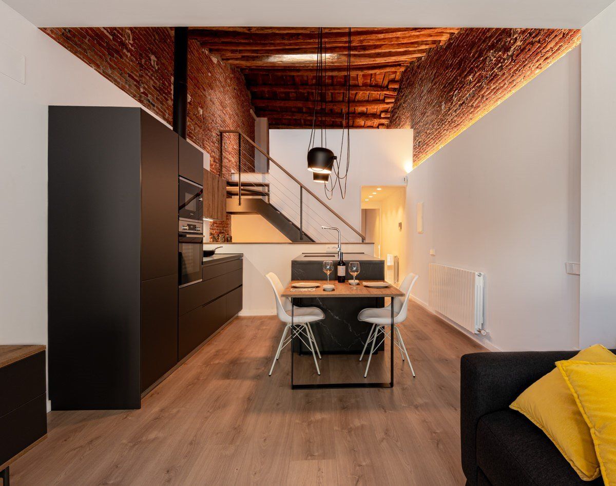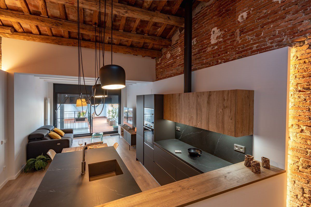 Vivienda entre medianeras en Sabadell en colaboración con Xavier López Arquitecto. Destacamos la iluminación indirecta hacia las zonas de obra vista creando ambientes cálidos y confortables, así como la composición de lámparas AIM de FLOS que preside el espacio de la isla central de la cocina abierta.