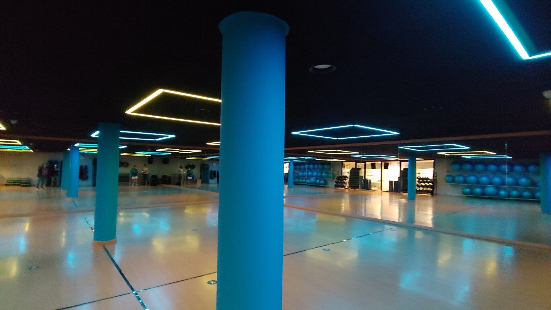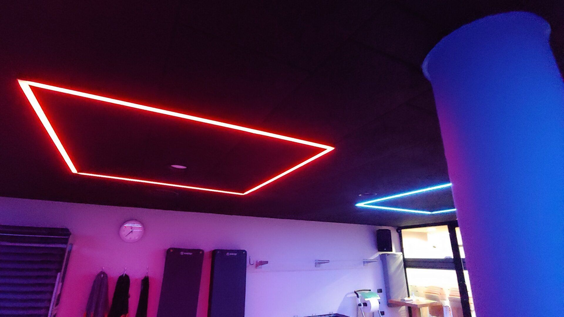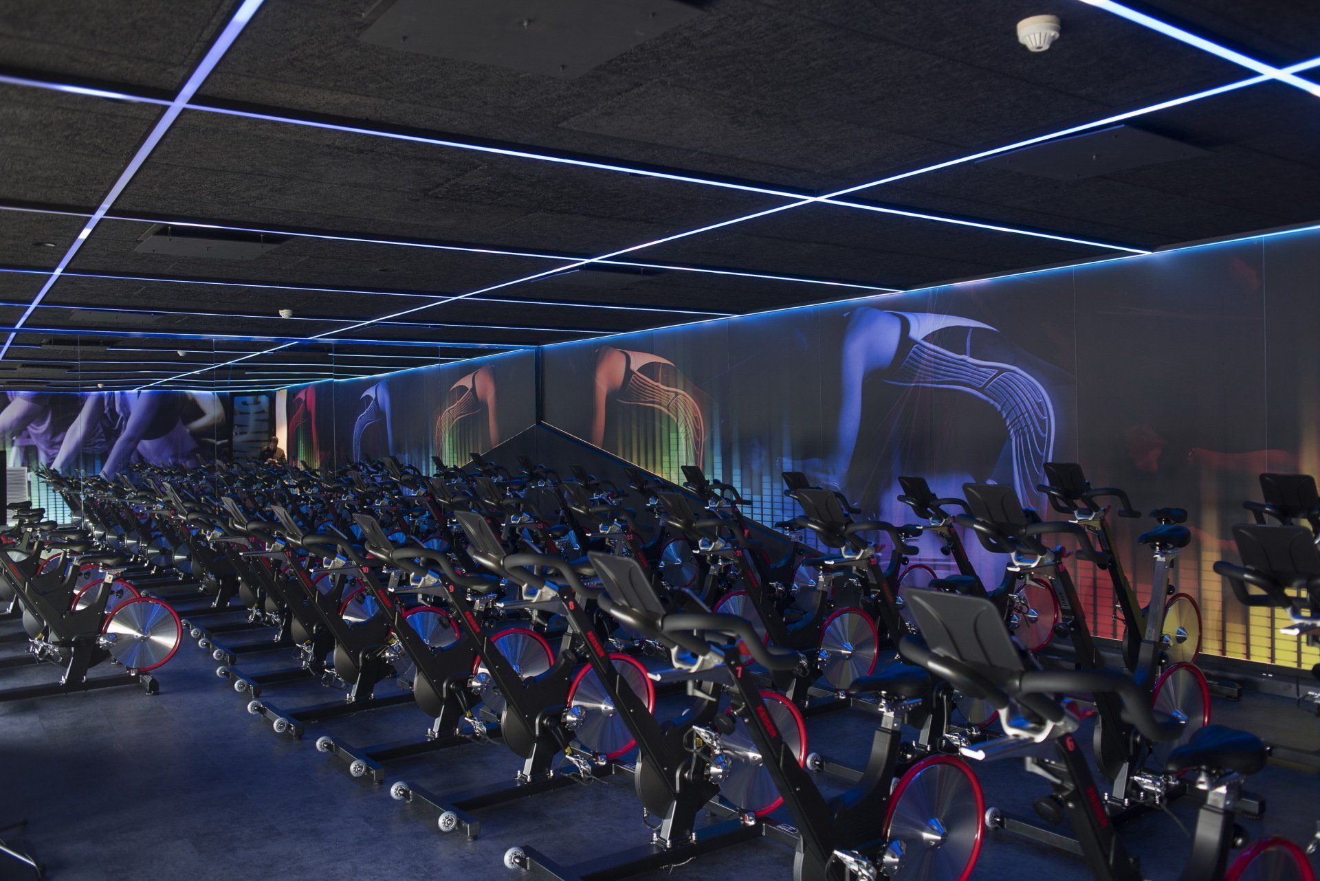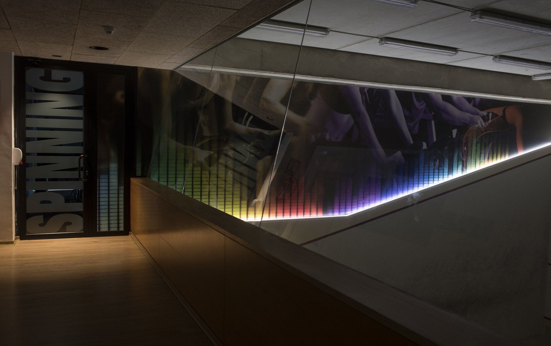 Espectacular iluminación en la sala de spinning hecha con perfiles y tiras LED digitales de Llúria Lighting Systems consiguiendo una iluminación dinámica y la posibilidad de programar escenas de luz, colores y movimiento.