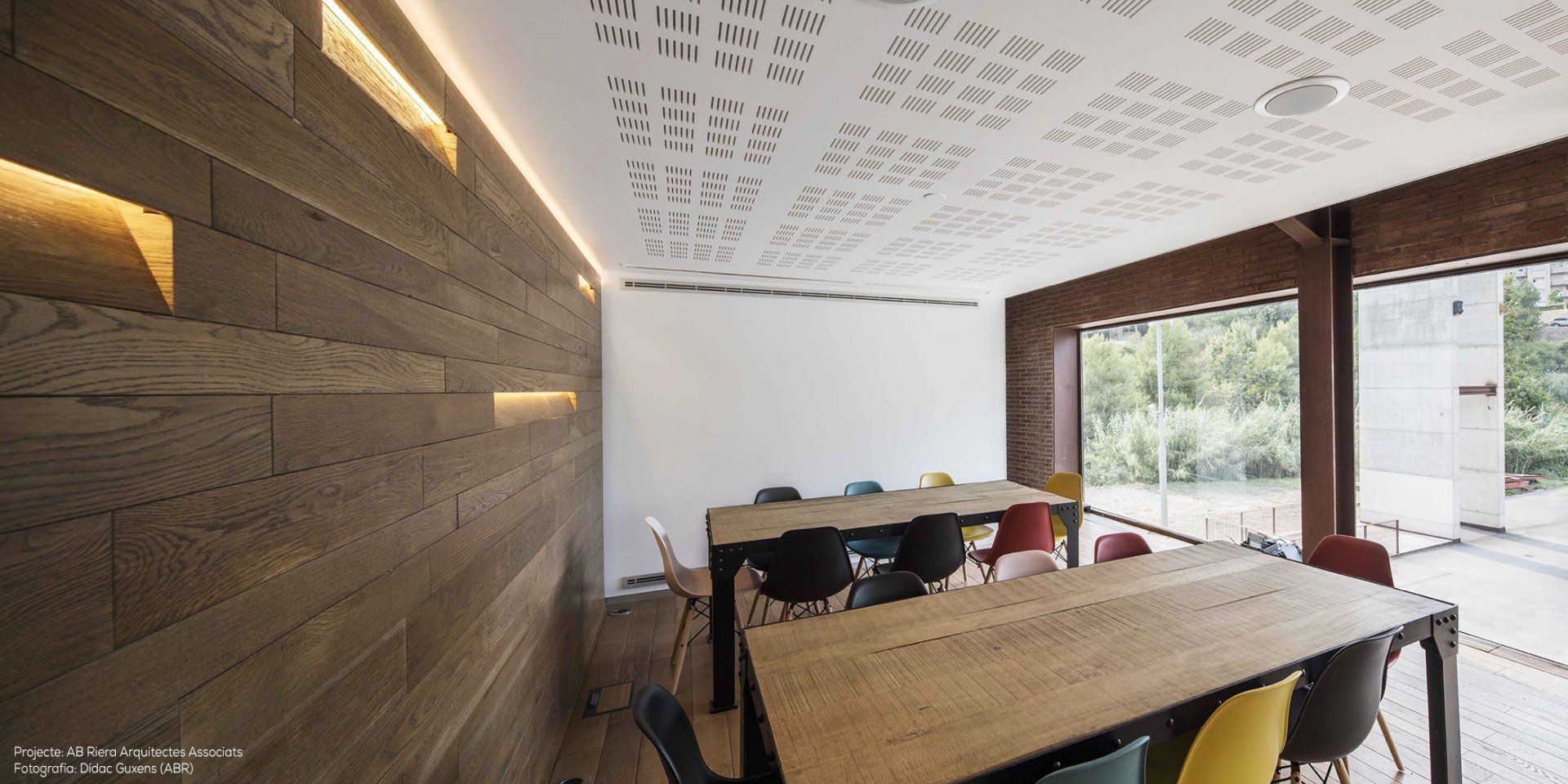 Proyecto de iluminación de la productora audiovisual "Producciones Del Barrio" en colaboración con ABR Arquitectos. Una iluminación pensada para convivir con los peculiares interiores de la empresa ubicada en la antigua fábrica de cerámica "La Baronda" de Esplugues de Llobregat. Destacan las luminarias Alphabet of Light de Artemide presidiendo los espacios comunes de trabajo, y las líneas LED de luz indirecta de Llúria Lighting System integradas en el diseño de los espacios.